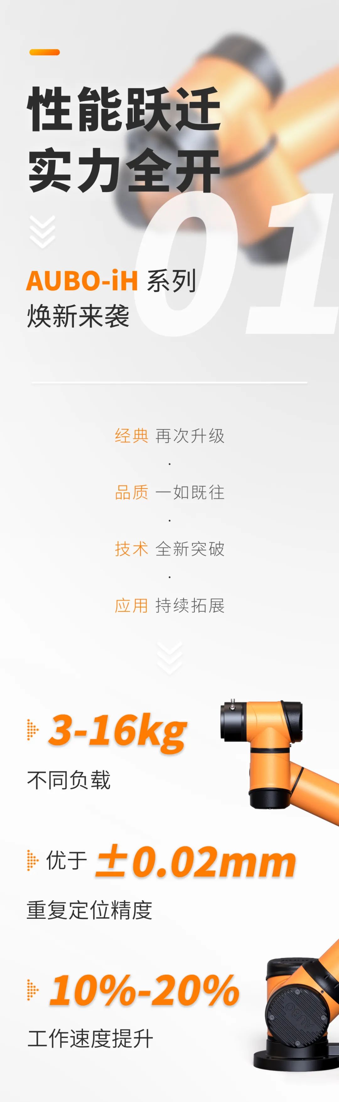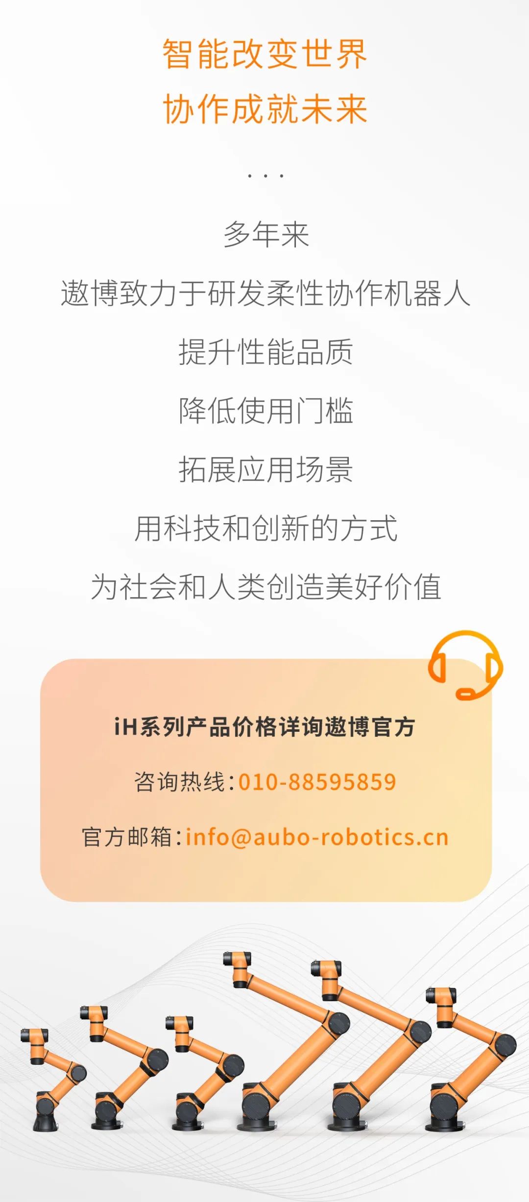 遨博iH系列协作机器人具有3-16kg不同负载能力,末端可自主搭配不同配件,在精度、速度、稳定性方面都有更佳的表现,可覆盖各行业差异性应用,更好地满足客户与市场需求。