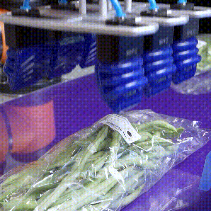 遨博协作机器人的末端,搭载软体自主研发的柔性夹爪,在执行抓取操作时,凭借夹爪硅胶材料的柔性,能够自适应地包覆住目标物体,无需根据种类、尺寸、形状、重量等进行预先调整,摆脱了传统生产线对统一尺寸、形状的束缚,具有较高的灵活性,可广泛应用于水果采摘、蔬菜分拣及抓取等应用场景,堪称拣装台上的“金牌传送员”。