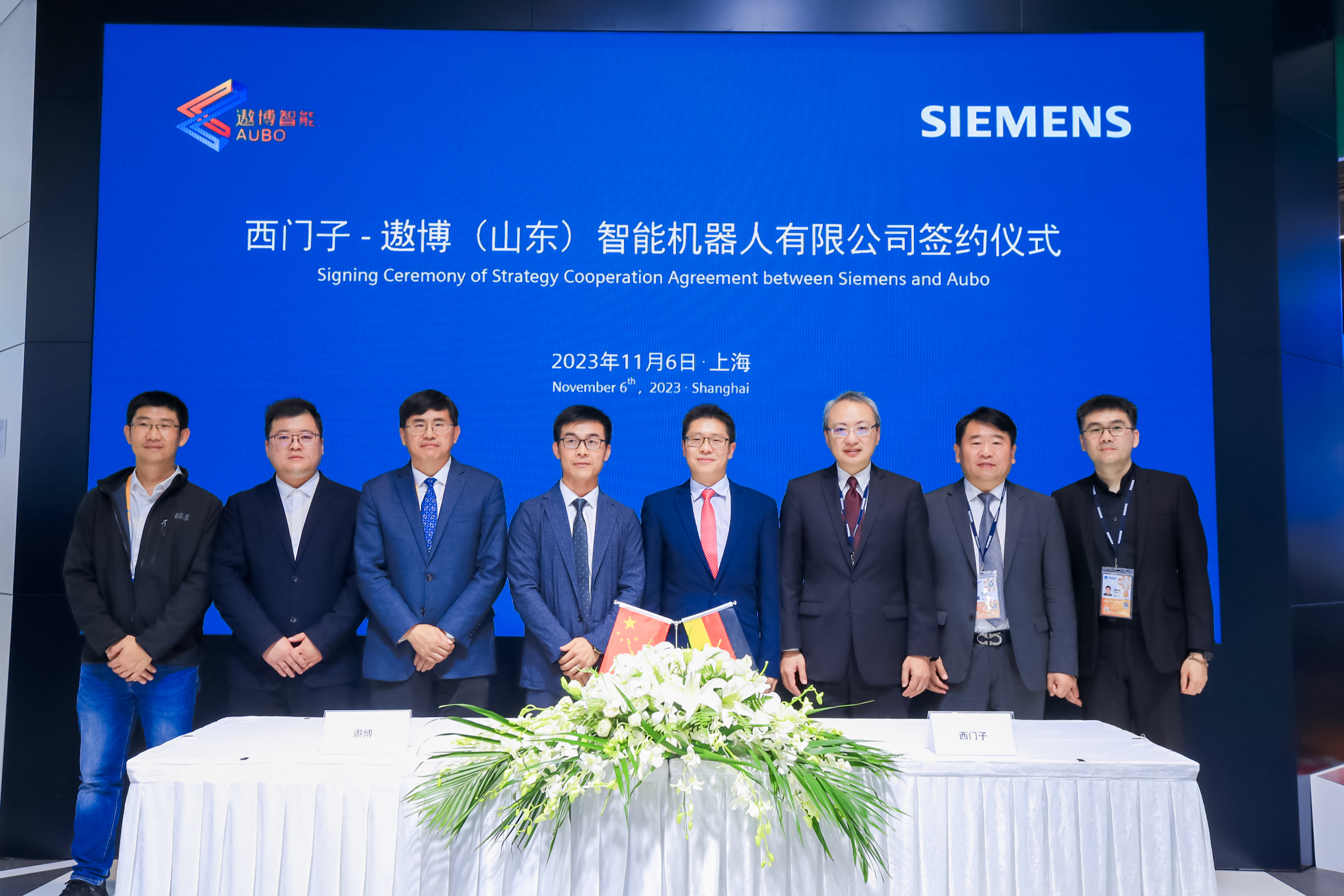 2023年11月6日,在进博会西门子展台上,遨博智能与西门子签署科技创新生态战略合作协议,遨博智能将加入西门子Xcelerator 生态,成为西门子Workflow Canvas(工易魔方)战略级别技术合作伙伴。遨博(北京)智能科技股份有限公司董事长魏洪兴与西门子(中国)有限公司执行副总裁、西门子中国研究院院长朱骁洵博士参与签约仪式,共同见证这一具有里程碑意义的关键时刻。